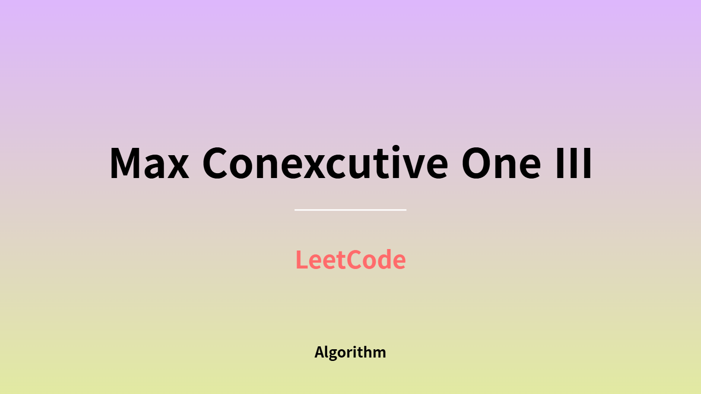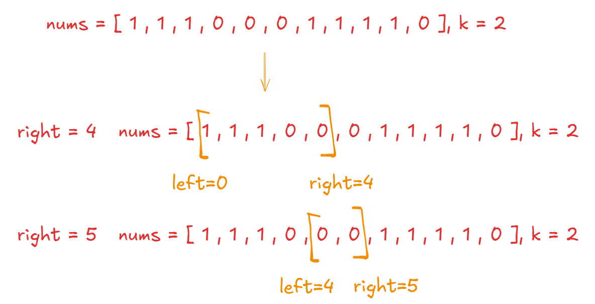 이 문제는 sliding window로 접근해서 풀면된다. 시간 복잡도는 O(n) 이며 right를 1씩 증가하면서 zeroCnt 가 > k 이면 zeroCnt가 k를 넘지 않을때까지 left를 이동한뒤 right-left+1을 이용하여 1의 갯수를 구할 수 있다.