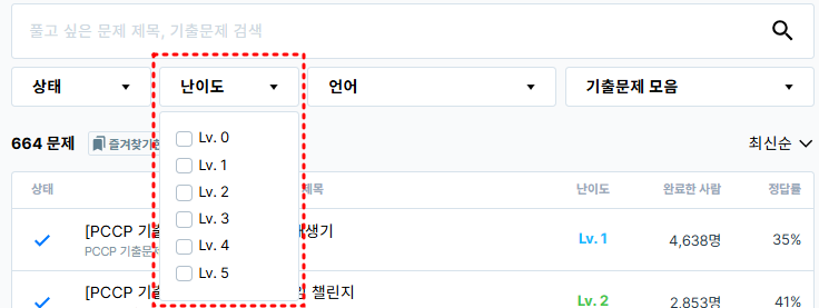 아래 링크에 들어가 난이도를 클릭하면 난이도를 선택할 수 있는데 lv0을 다풀면 lv1을 다풀고 그 후 lv2를 풀기 시작했다.